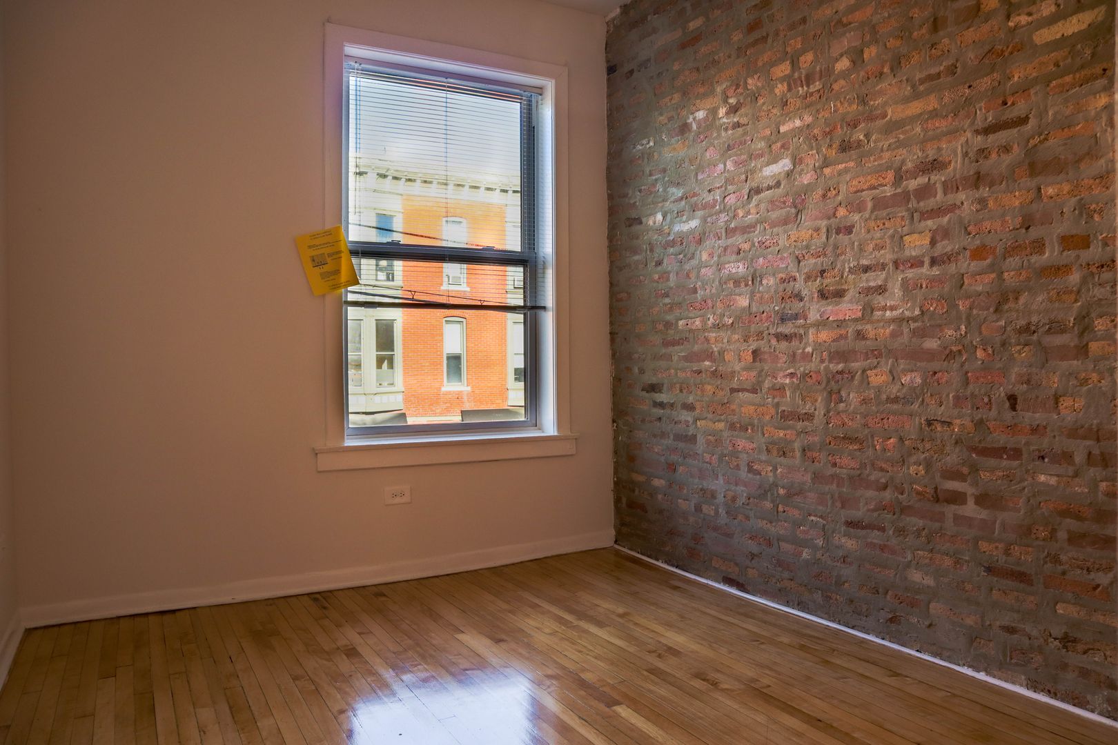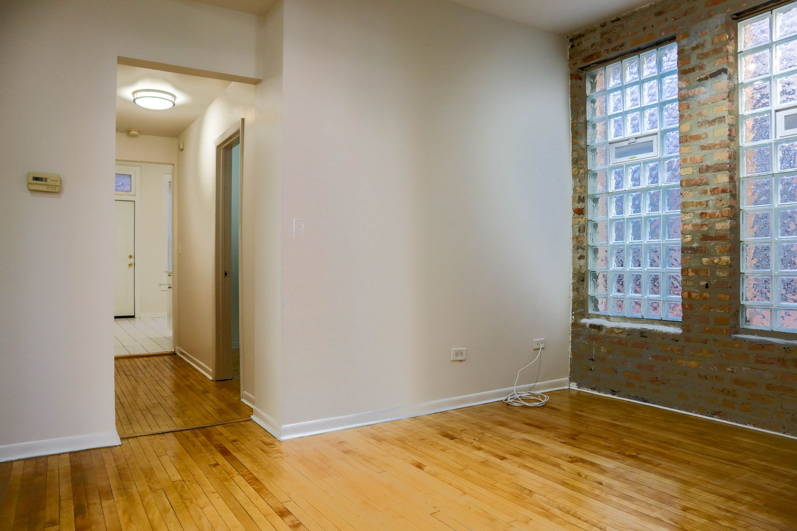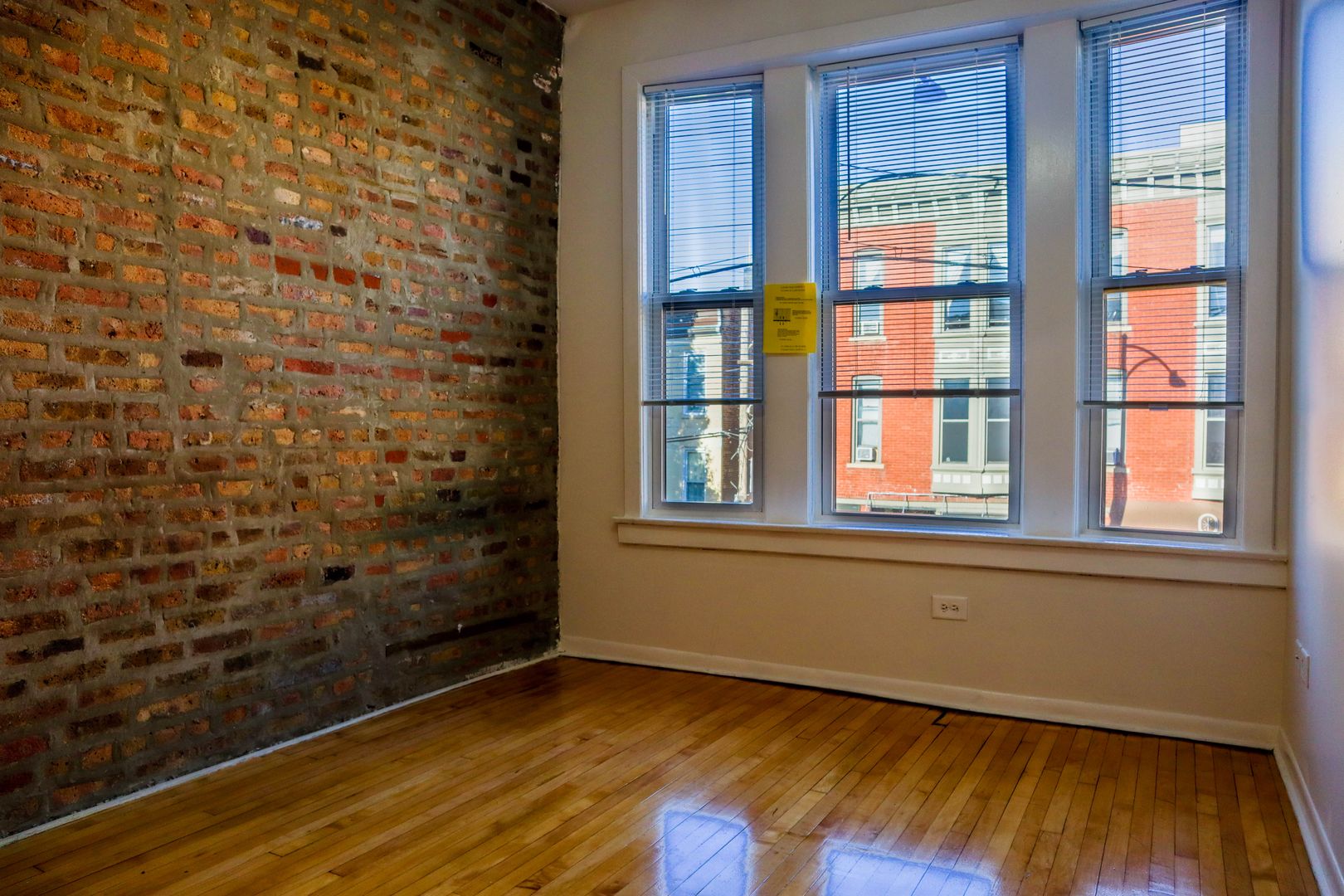 - Hardwood floors and exposed brick walls in living room and bedrooms.